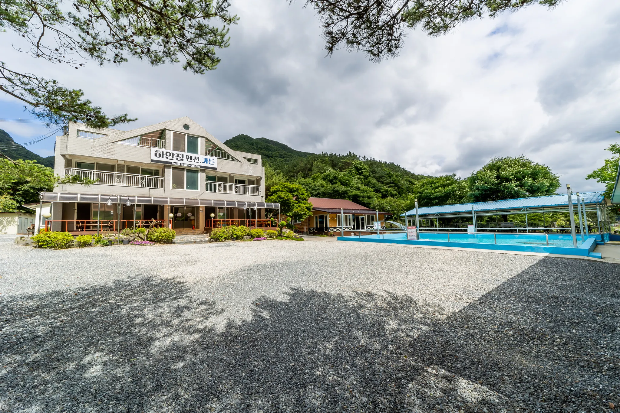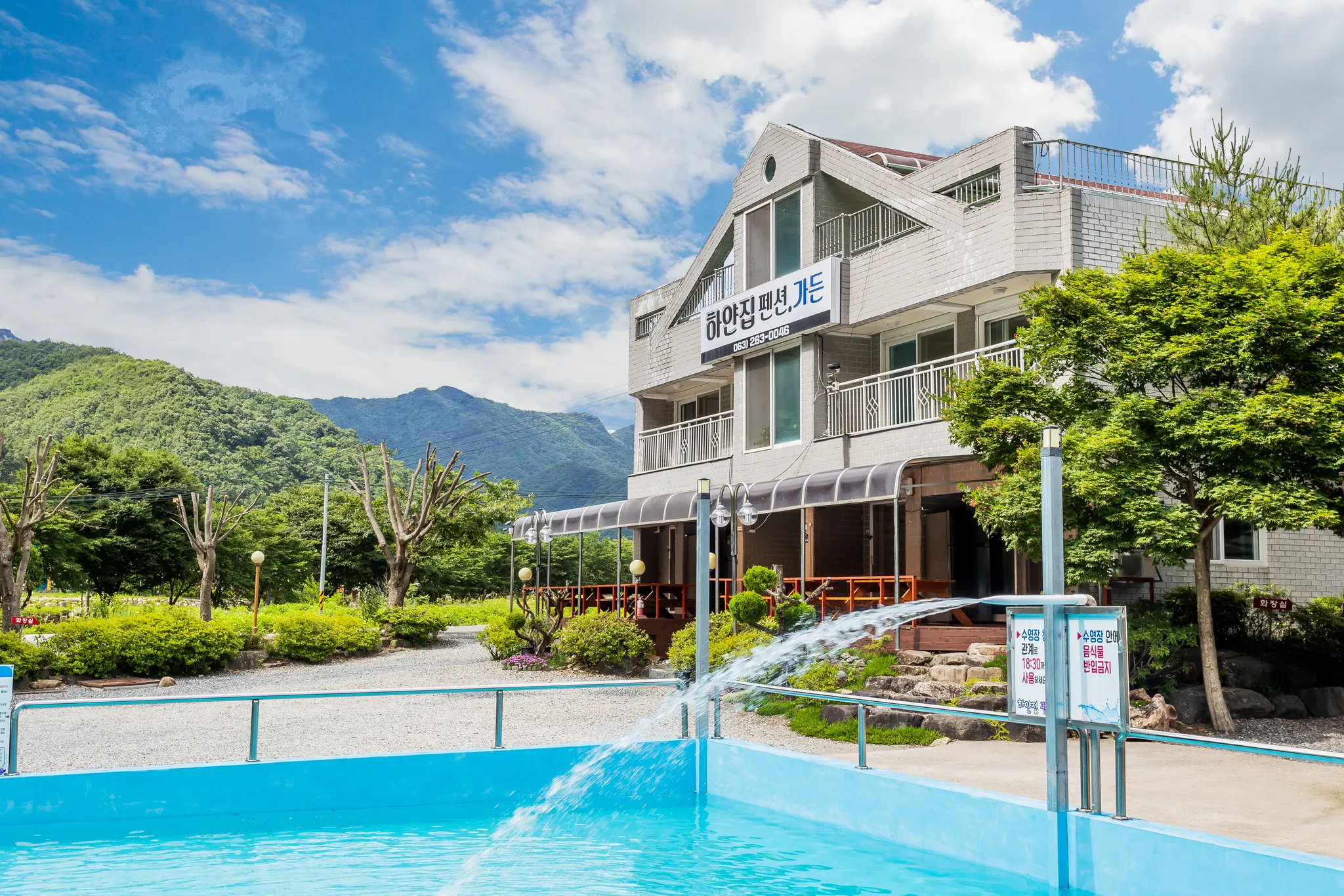 하얀집 본관 건물과 통나무집, 그리고 ~ 수영장이 있습니다.